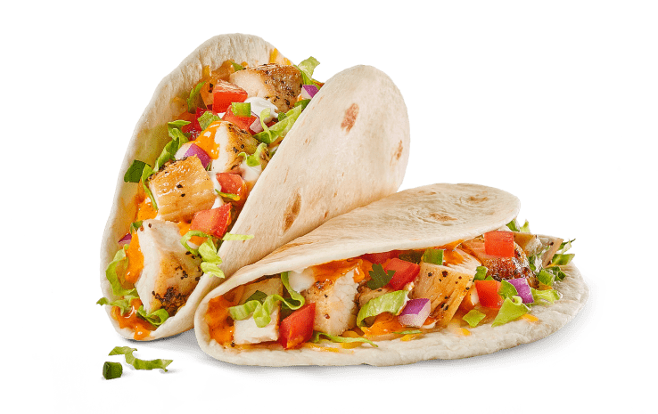 Wheat tortilla with spicy chicken bites, cheese sauce, tomatoes and soft cheese